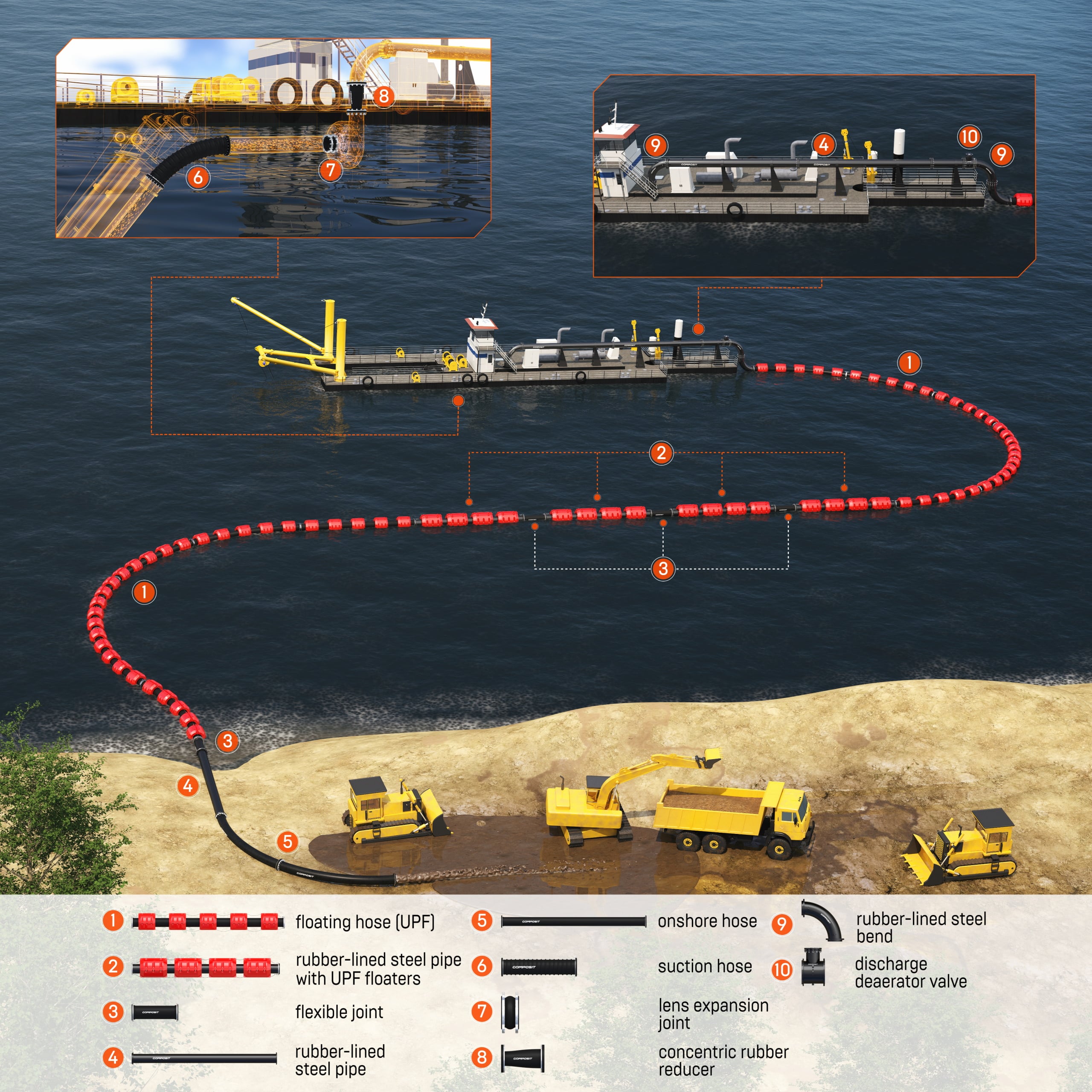 The construction of floating hoses is unique. Its float is designed for different conditions and dredging equipment peculiarities. The floating pulp line ensures high productivity and smooth operation without the need for technical support.