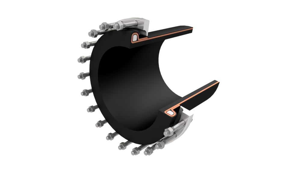 Линзовый компенсатор изготовлен из резины на основе натурального или синтетического каучука для увеличения износостойкости, а прочность изделия достигается благодаря использованию кордной ткани.